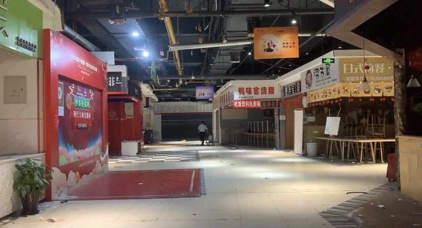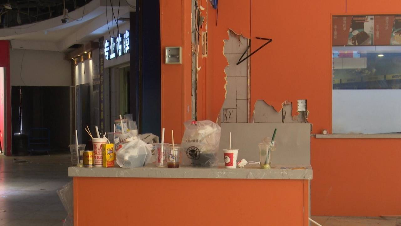 现代天地一楼原先是美食广场,里面开着几十家大大小小的小吃店、奶茶店等,而如今,除了门口和里面的几家店铺还在营业外,其余的大部分都已经关闭。因为商户已经撤出,里面光线昏暗,一些桌椅和相关设备,被随意地堆放在一起,台面上、地面上,到处散落着已使用过的食品包装盒,生活垃圾遍地、环境脏乱。离得近了,还能闻到阵阵臭味。