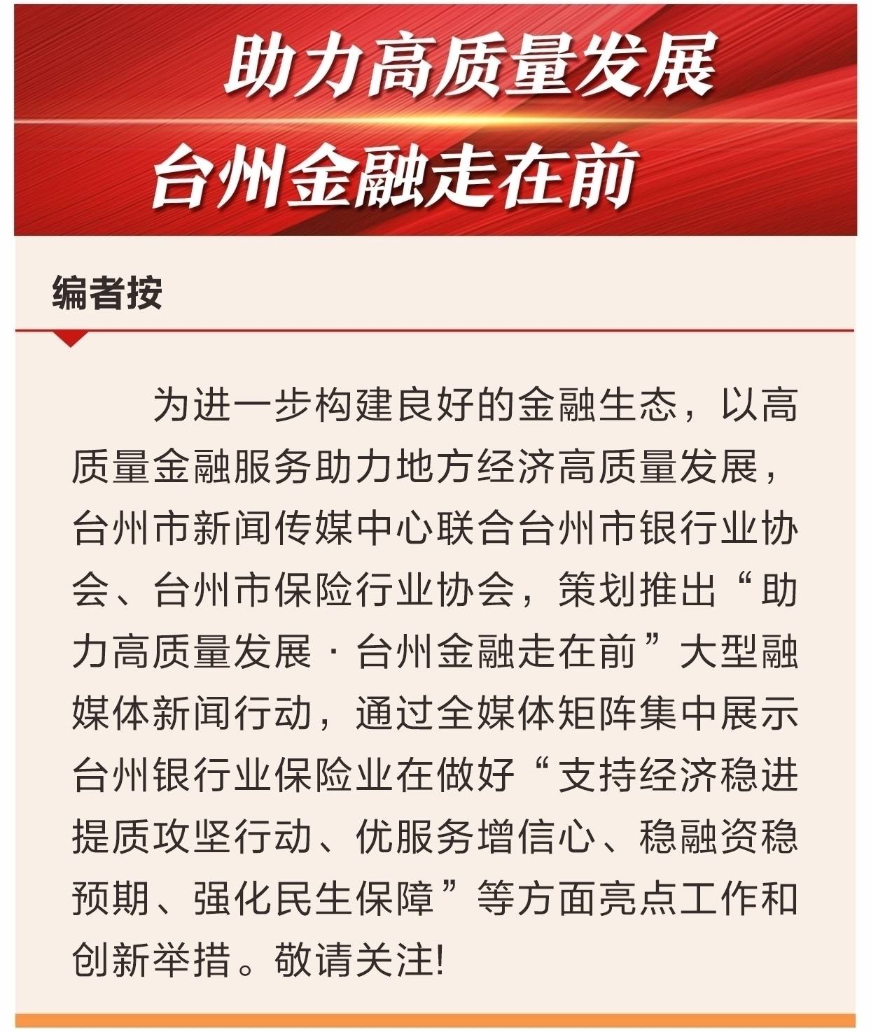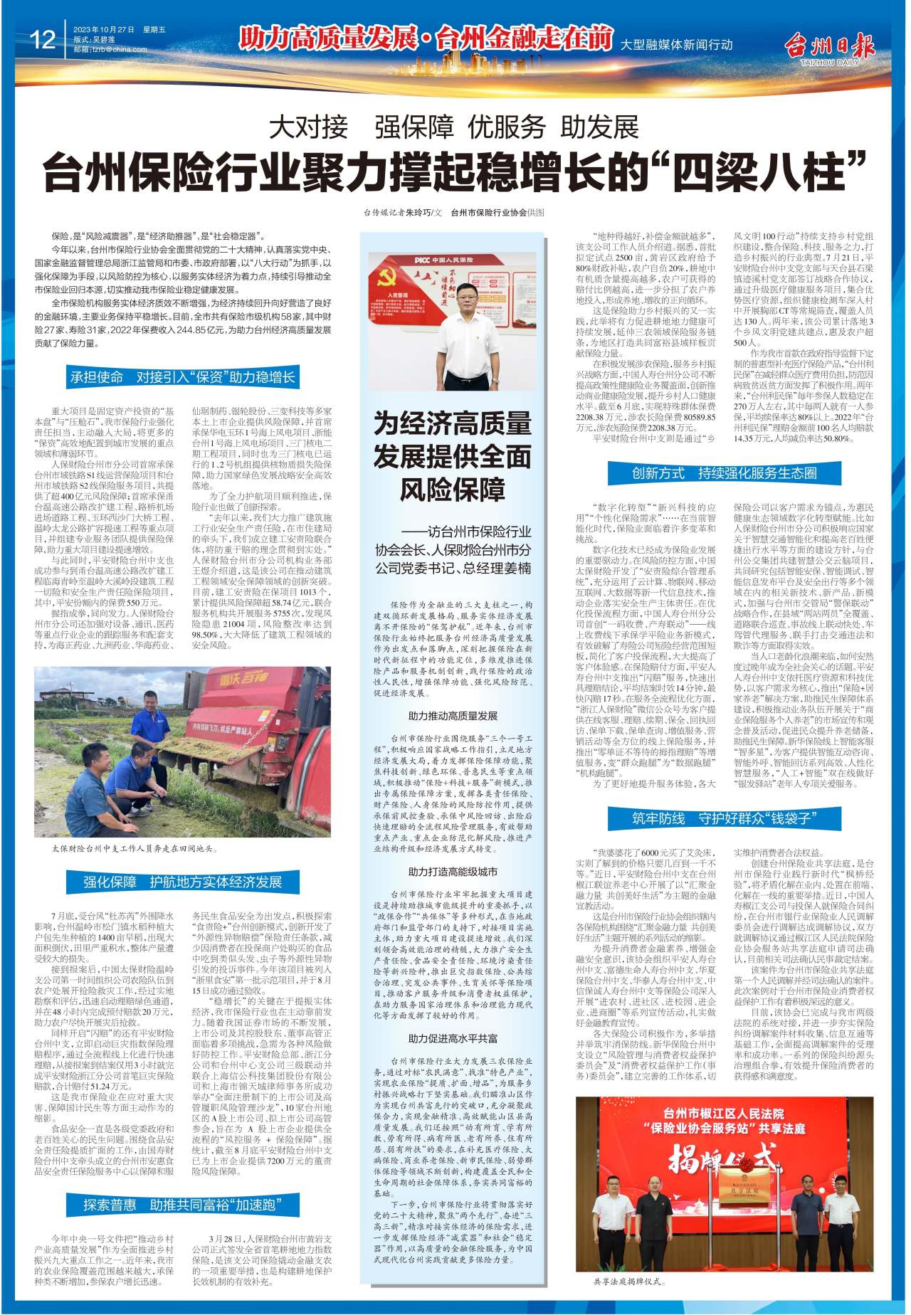 台州市保险行业围绕服务“三个一号工程”,积极响应国家战略工作指引,立足地方经济发展大局,着力发挥保险保障功能,聚焦科技创新、绿色环保、普惠民生等重点领域,积极推动“保险+科技+服务”新模式,推出专属保险保障方案,发挥各类责任保险、财产保险、人身保险的风险防控作用,提供承保前风控查验、承保中风险回访、出险后快速理赔的全流程风险管理服务,有效帮助重点产业、重点企业防范化解风险,推进产业结构升级和经济发展方式转变。