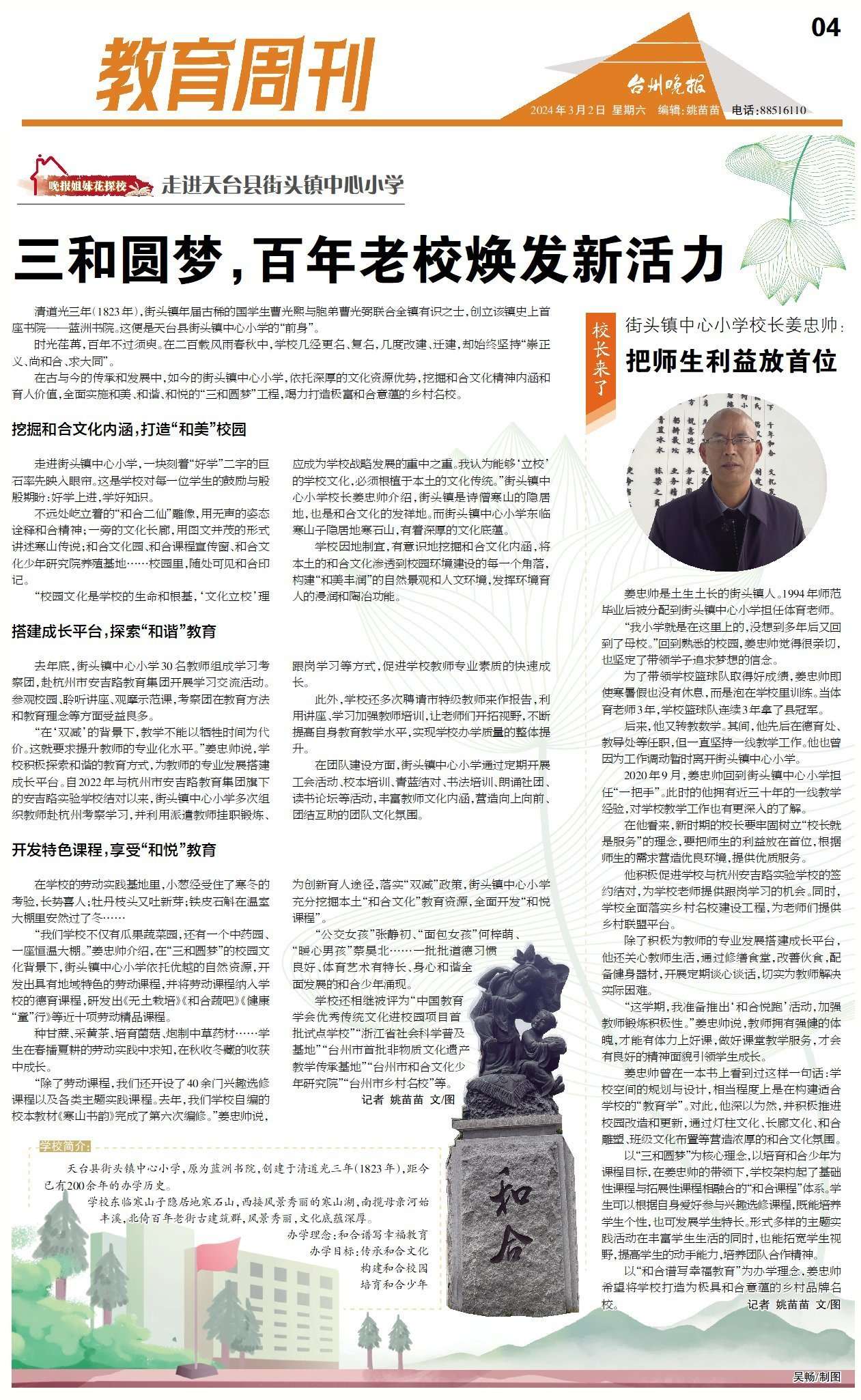 在古与今的传承和发展中,如今的街头镇中心小学,依托深厚的文化资源优势,挖掘和合文化精神内涵和育人价值,全面实施和美、和谐、和悦的“三和圆梦”工程,竭力打造极富和合意蕴的乡村名校。