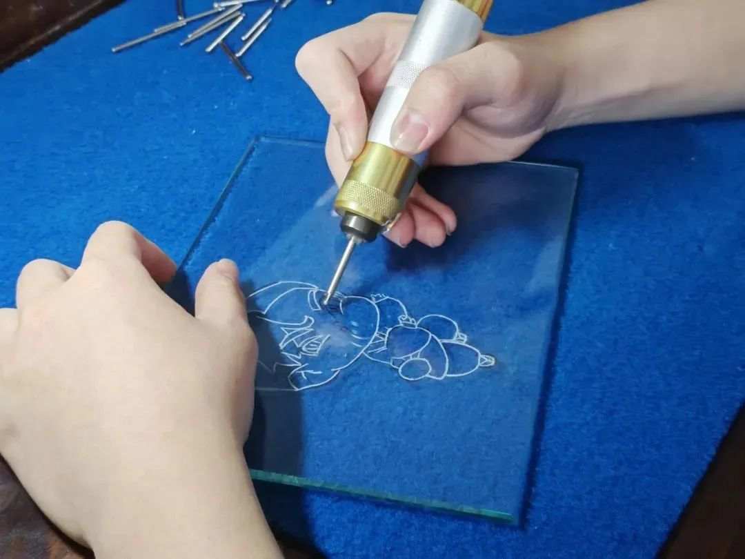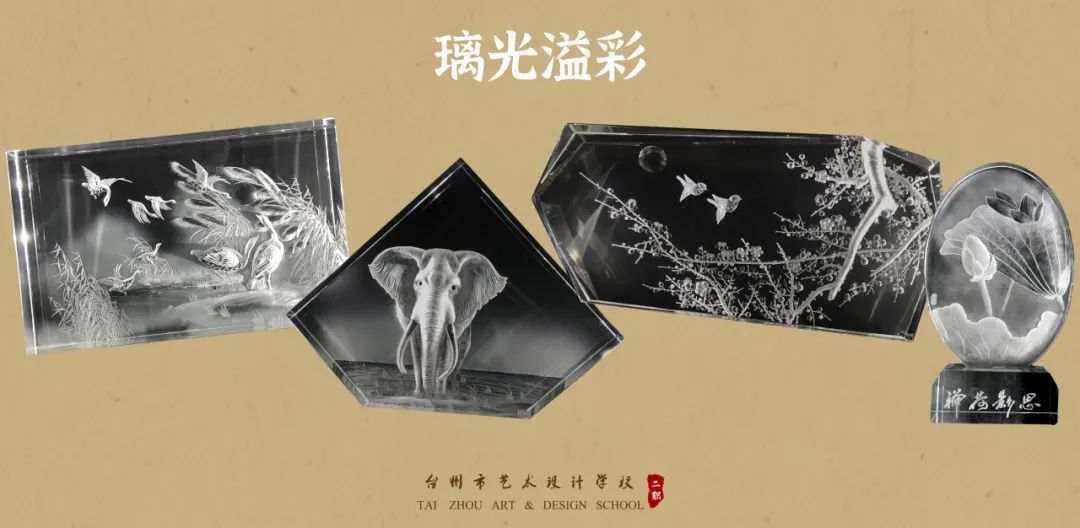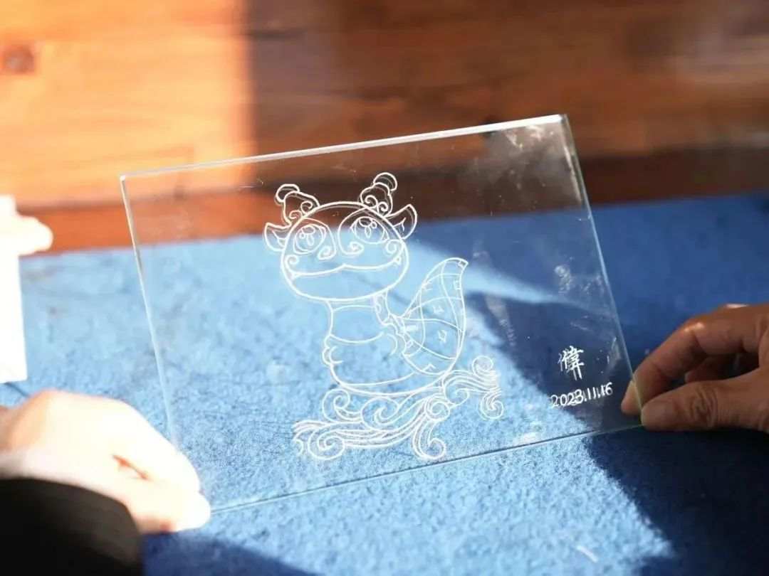 台州玻璃雕刻是独具地方文化特色的民间艺术,是以砂轮为“笔”玻璃为“纸”用砂轮在玻璃上刻画写字的一种特殊技艺。以博物馆文物为雕刻内容,让大家体验精美的玻雕。