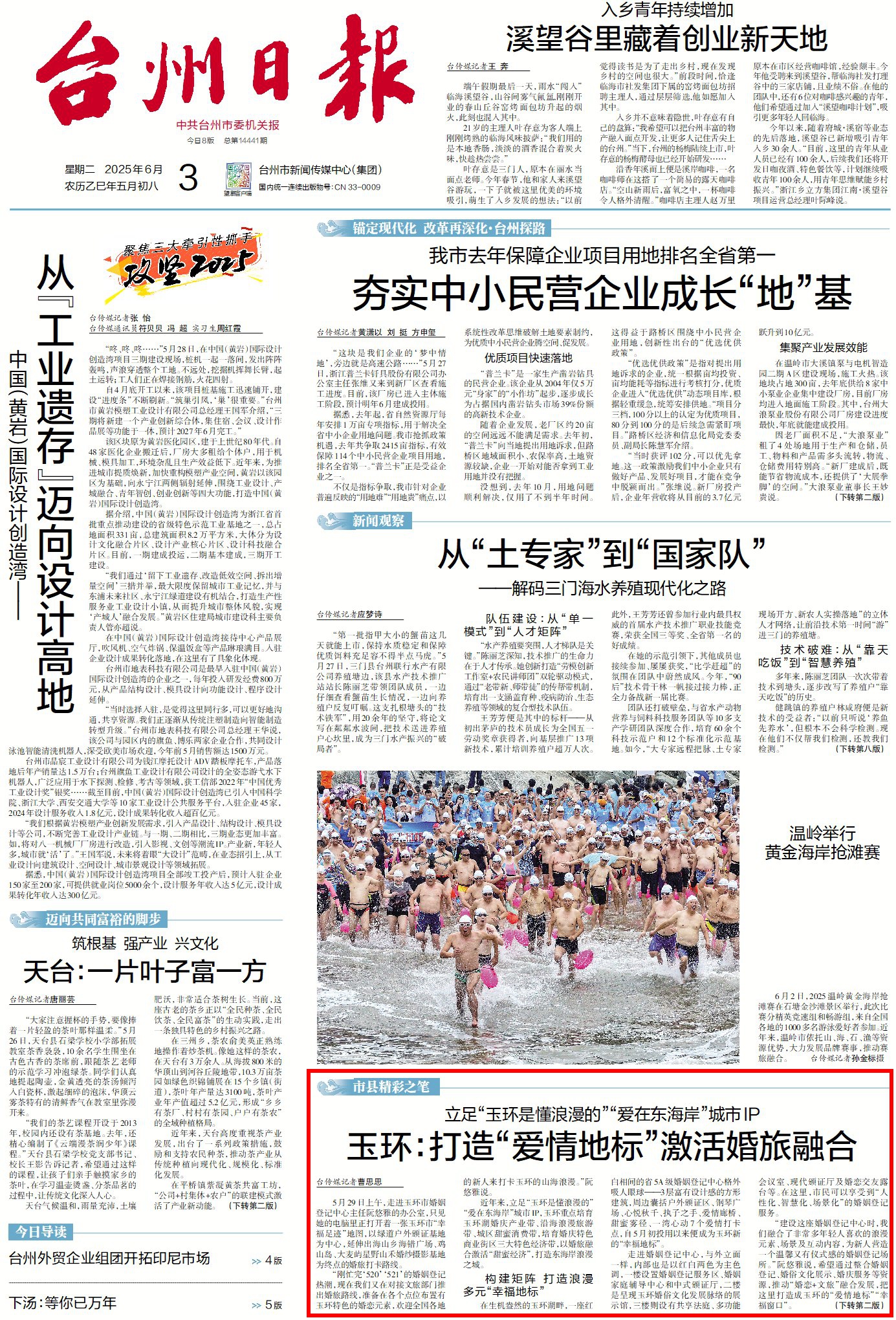 近年来,立足“玉环是懂浪漫的”“爱在东海岸”城市IP,玉环重点培育玉环湖婚庆产业带、沿海浪漫旅游带、城区甜蜜消费带,培育婚庆特色商业街区三大特色经济带,以婚旅融合激活“甜蜜经济”,打造东海岸浪漫之城。