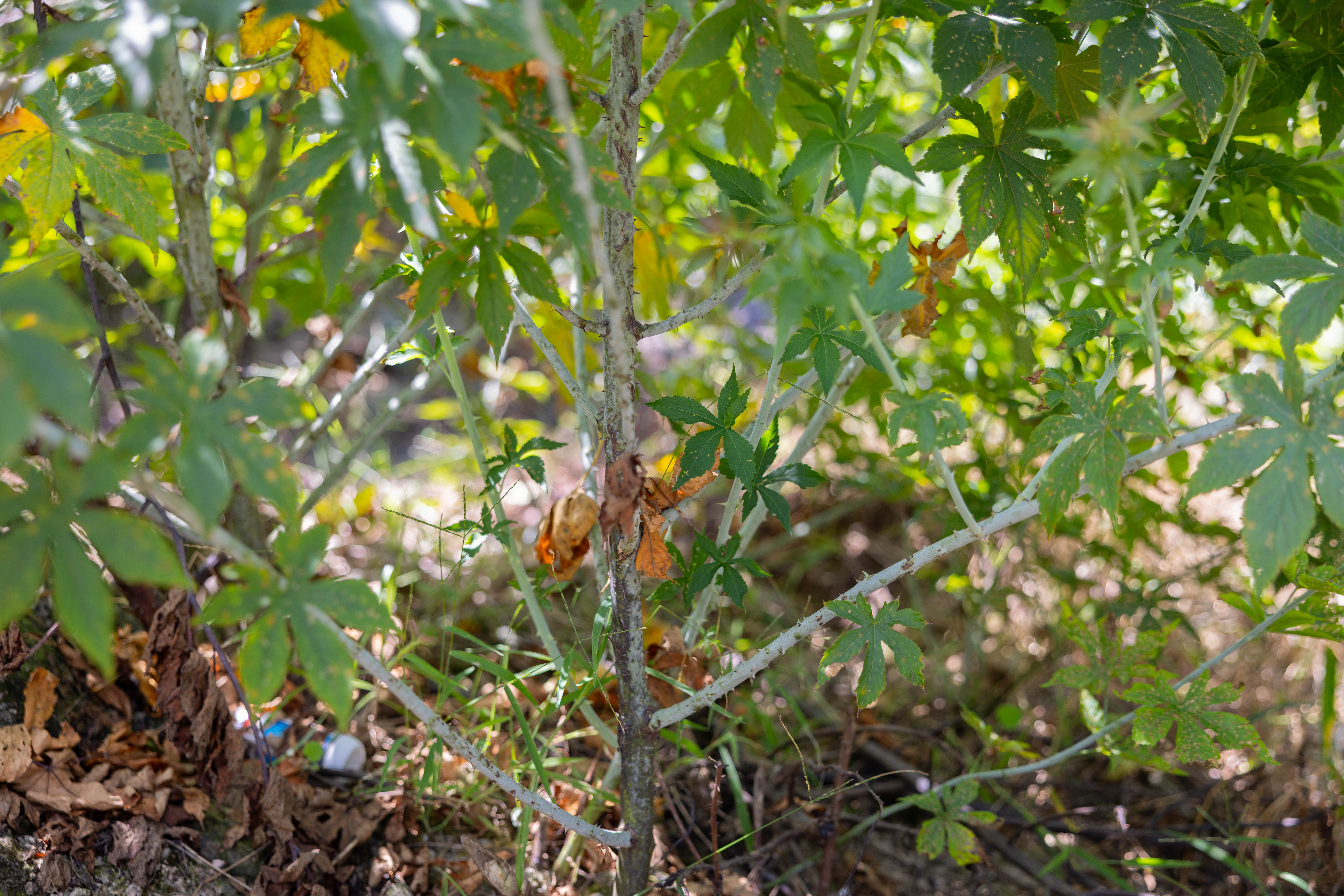 掌叶覆盆子密密麻麻长了一地,植株高达两米多,却因顶端水分不足、不通风不透光,导致果实寥寥。更棘手的是,其茎枝上皮刺密布,又彼此交错、不留间隙,致使人无法进入田间采摘果实。