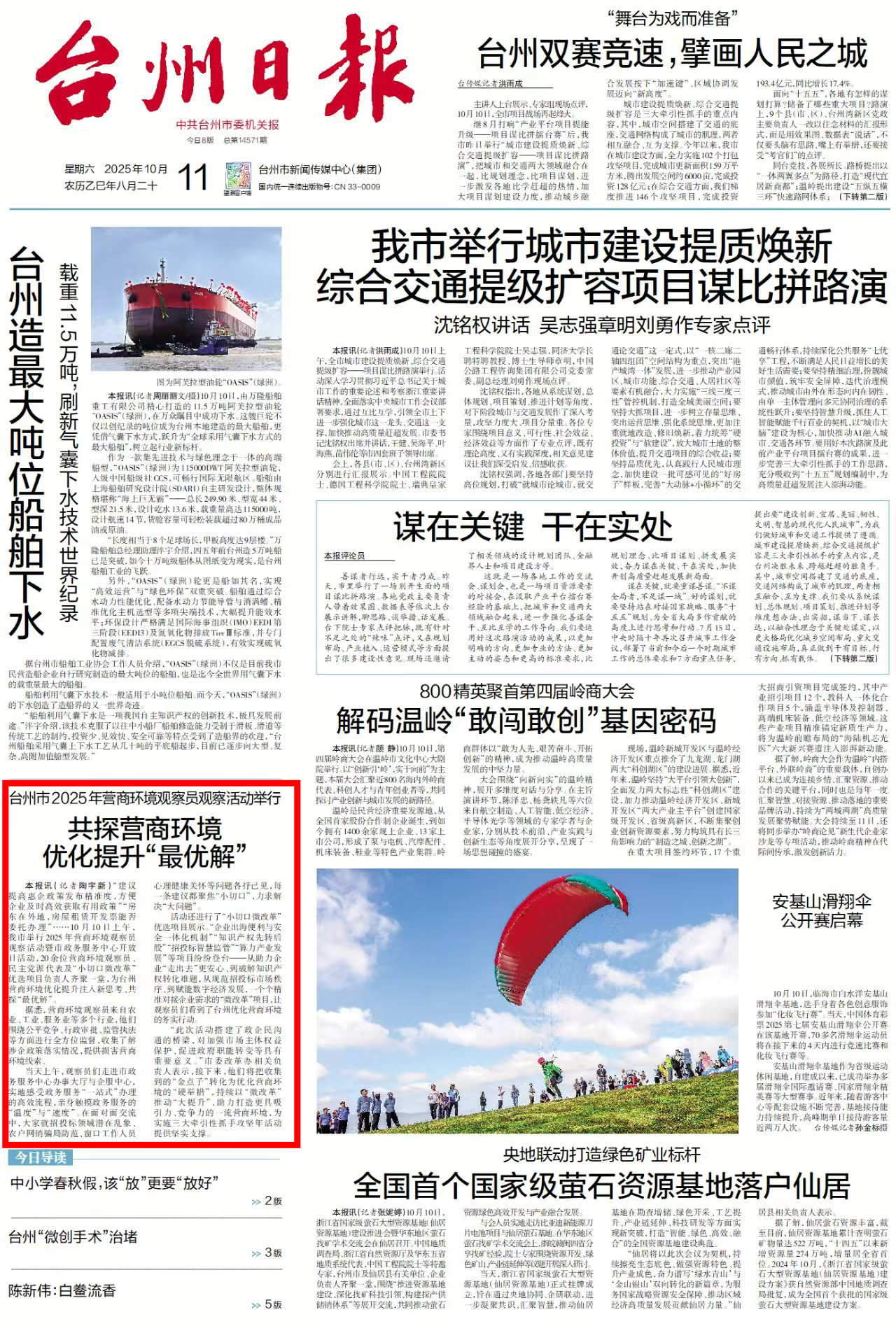 “建议提高惠企政策发布精准度,方便企业及时高效获取有用政策”“房东在外地,房屋租赁开发票能否委托办理”……10月10日上午,我市举行2025年营商环境观察员观察活动暨市政务服务中心开放日活动,20余位营商环境观察员、民主党派代表及“小切口微改革”优选项目负责人齐聚一堂,为台州营商环境优化提升注入新思考、共探“最优解”。