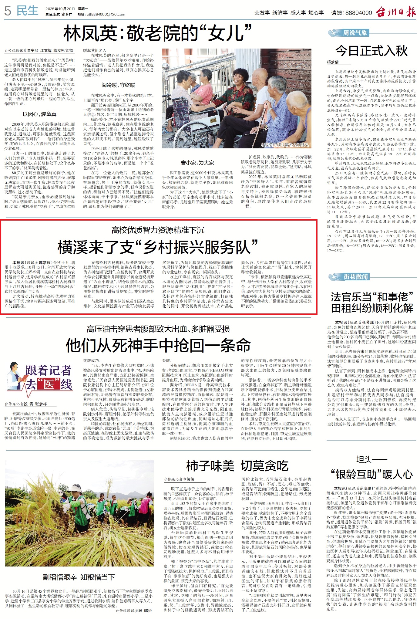 在郑桥村古杨梅林,服务队穿梭于苍劲葱郁的古杨梅林间,细致查看生长状态,为古树健康“把脉”。在杨梅树下,台州开放大学农创联盟常务副理事长黄金道现场开起了“农业小课堂”,结合眼前树木的实际情况,将种植技术化为浅显易懂的语言,为围拢的梅农们讲解管护要点,并实时解答疑难。