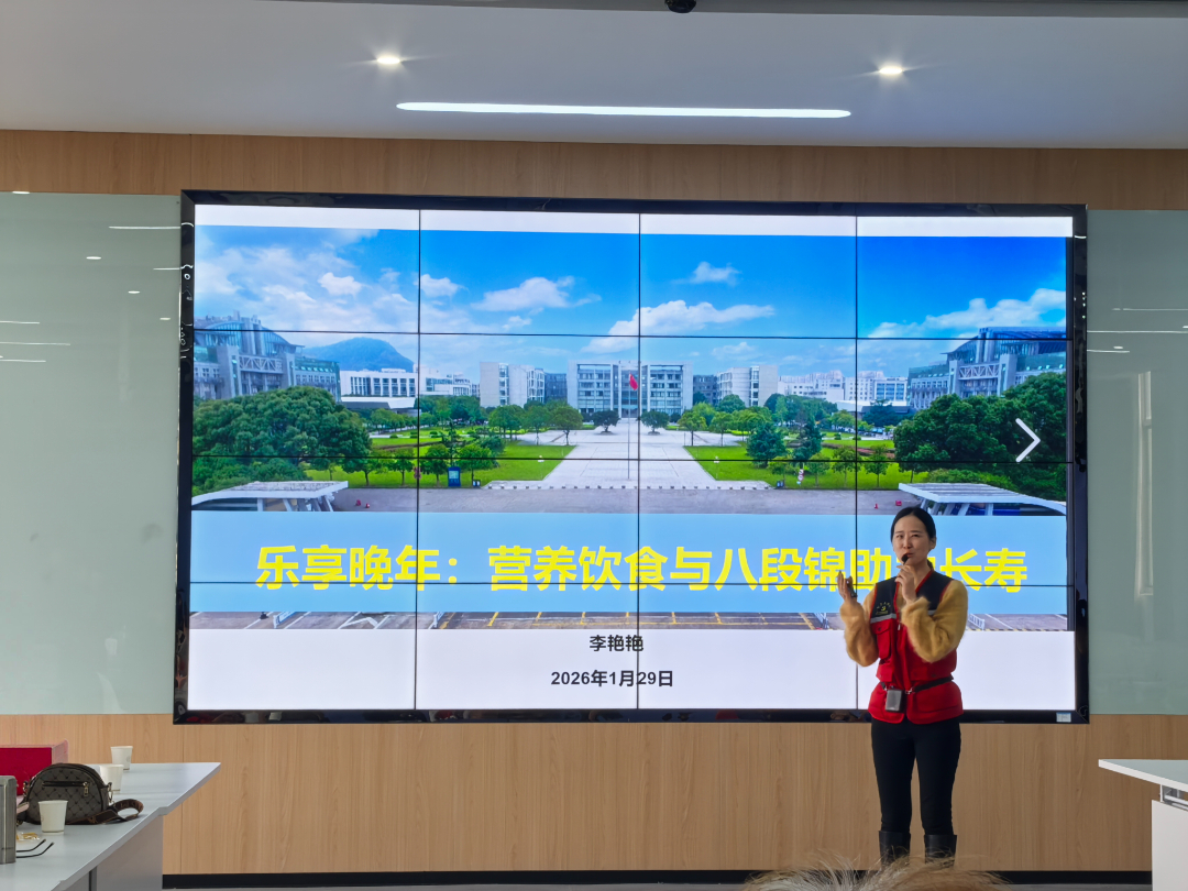 随后,护理专业李艳艳老师带领大家学习“乐享健康晚年:营养饮食与八段锦助力长寿”。李老师耐心示范八段锦的每个动作,老干部们在老师的指导下,缓缓舒展身体,感受传统养生文化的魅力。“这个动作真舒服,我以前也学过,但没这么规范。”一位老干部笑着说道。