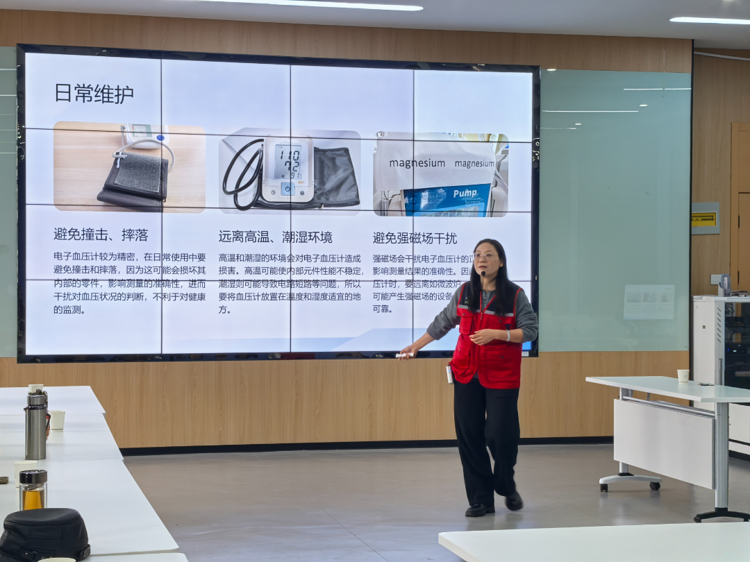 活动伊始,医药学院的林琴老师为老干部们带来“慢病管理小讲堂:血压和血糖的守护”。林老师不仅详细讲解了血糖仪与血压仪的正确使用方法,还结合实际案例,为老干部们提供了日常慢病管理的实用建议。“以前用血压计总不得要领,今天终于明白了,谢谢林老师!”老干部李爷爷一边操作一边感慨。