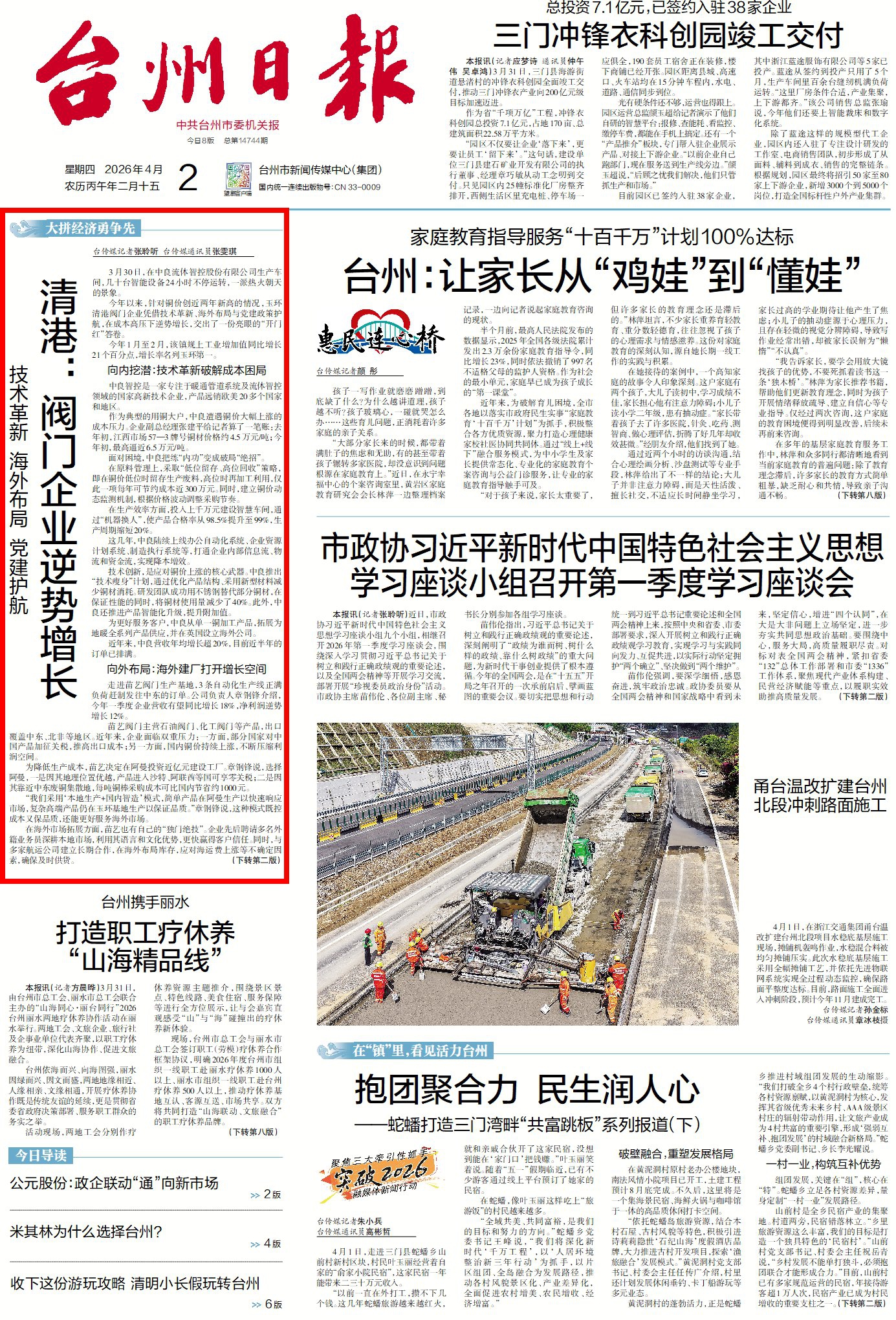 走进苗艺阀门生产基地,3条自动化生产线正满负荷赶制发往中东的订单。公司负责人章钢锋介绍,今年一季度企业营收同比有望增长18%,净利润逆势增长12%。